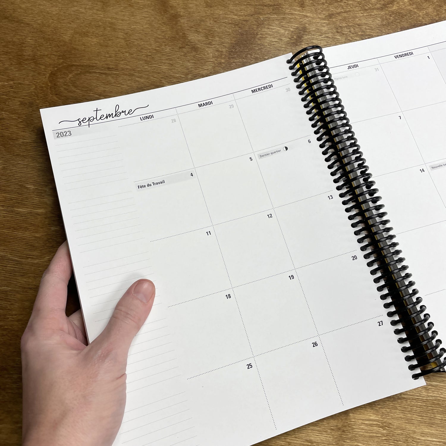 Il comprend 12 calendriers mensuels sur 2 pages. Entre chacun des calendriers sont ajoutées 4 pages de notes à pois (une par semaine) pour écrire des notes ou planifier les grandes lignes de chaque semaine. Il y a aussi 20 autres pages de notes à la fin, pour un total de 100 pages pour le 12 mois et de 128 pages pour le 18 mois (13 pages de notes).