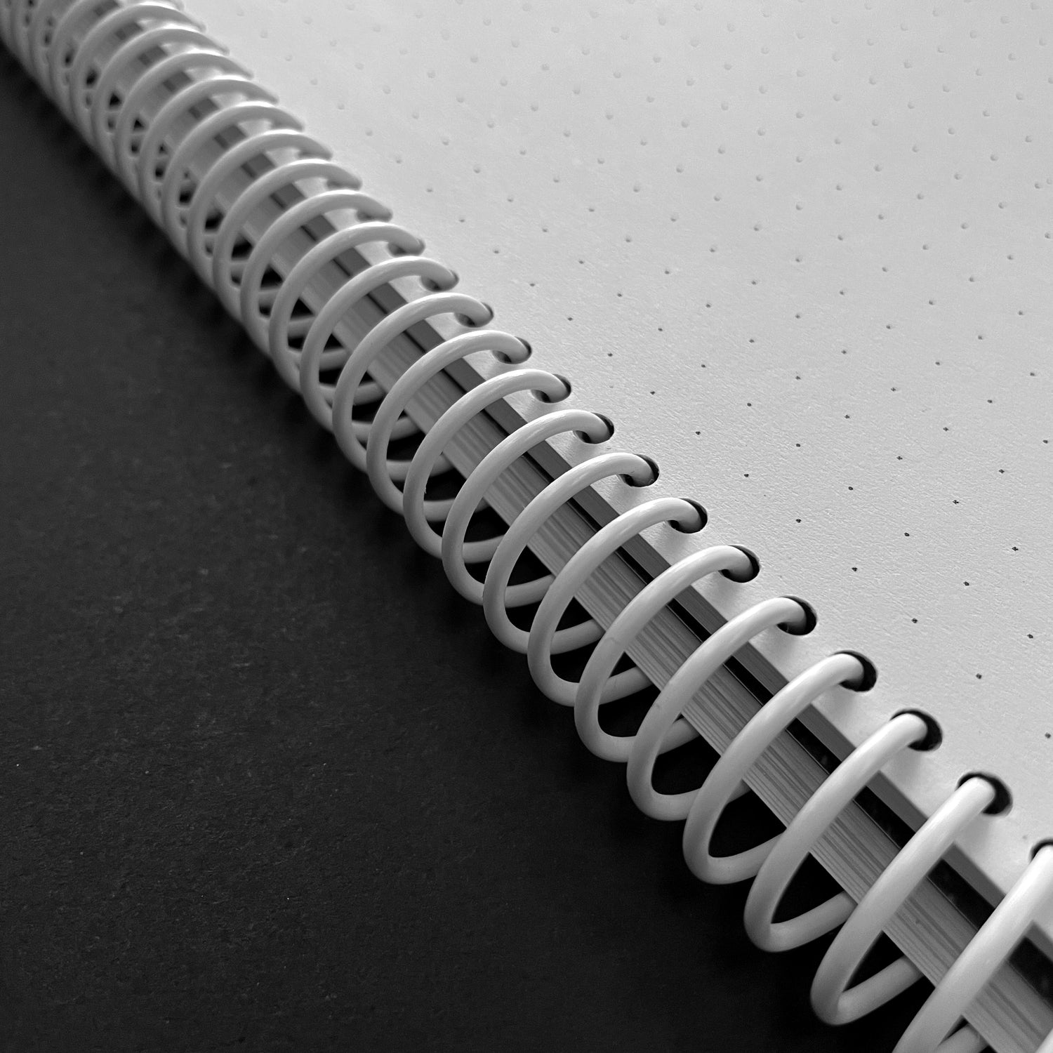 C’est la reliure traditionnelle spirale en plastique. Elle est résistante, permet une ouverture à plat pour faciliter la consultation (agendas, guides pratiques, cahiers d’exercice, etc.) et les feuilles ne peuvent pas en tomber. Point négatif: il faut savoir exactement quelles pages on veut et dans quel ordre parce qu’on ne peut plus les changer une fois que c’est relié.