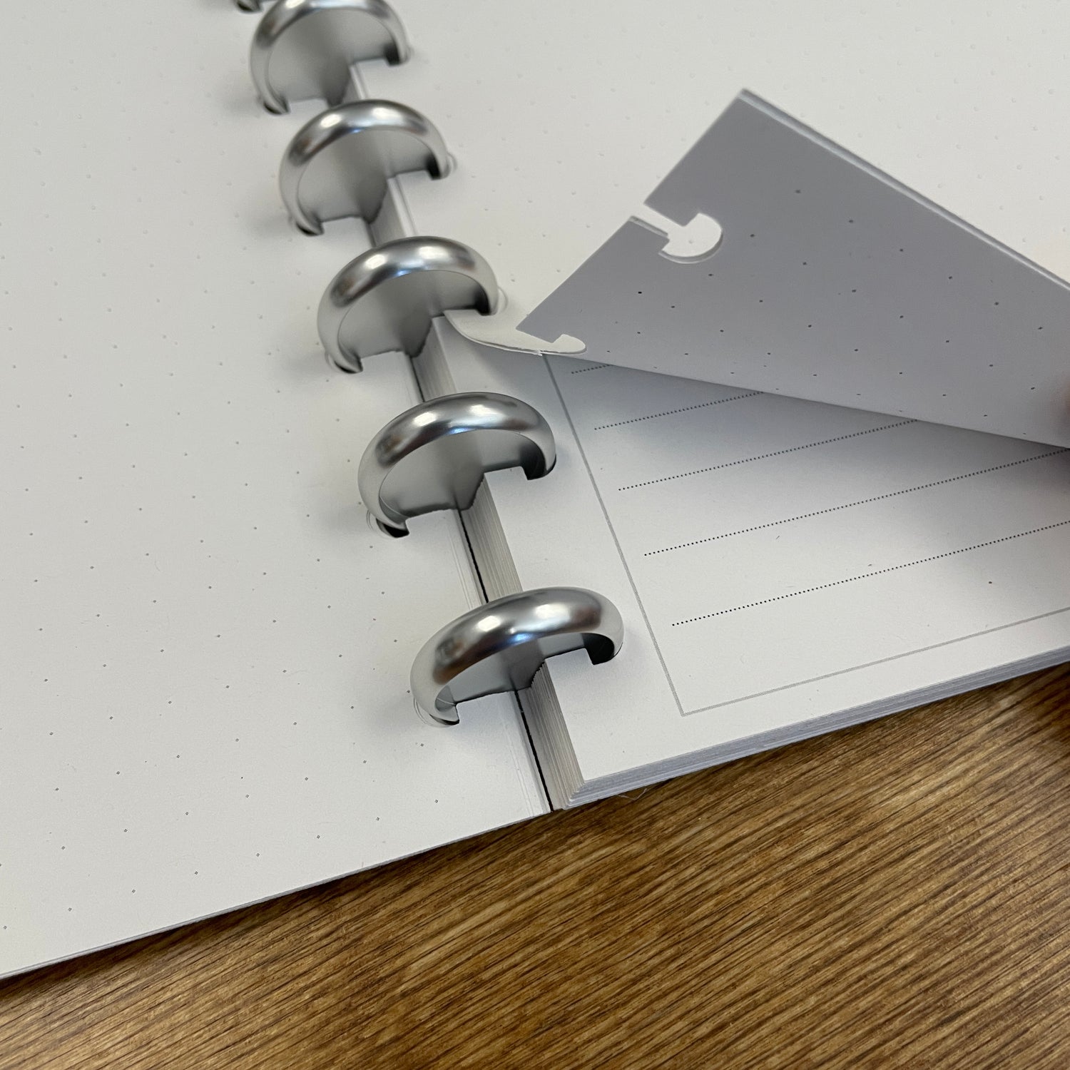 Dernière arrivée sur le marché, c’est la rencontre entre la reliure spirale traditionnelle et le bon vieux cartable. Les perforations sont en forme de “champignons” qui permettent d’accrocher les feuilles aux disques (dont tu auras besoin et qui se vendent à part) tout en te laissant la liberté de les enlever/remettre/déplacer au besoin, un peu comme un cartable. Tu as donc le look et la stabilité d’une reliure traditionnelle mais avec les avantages du cartable, sans devoir t’encombrer dudit cartable! Tu peux également réutiliser tes disques et ta couverture d’une année à l’autre avec ce système.
